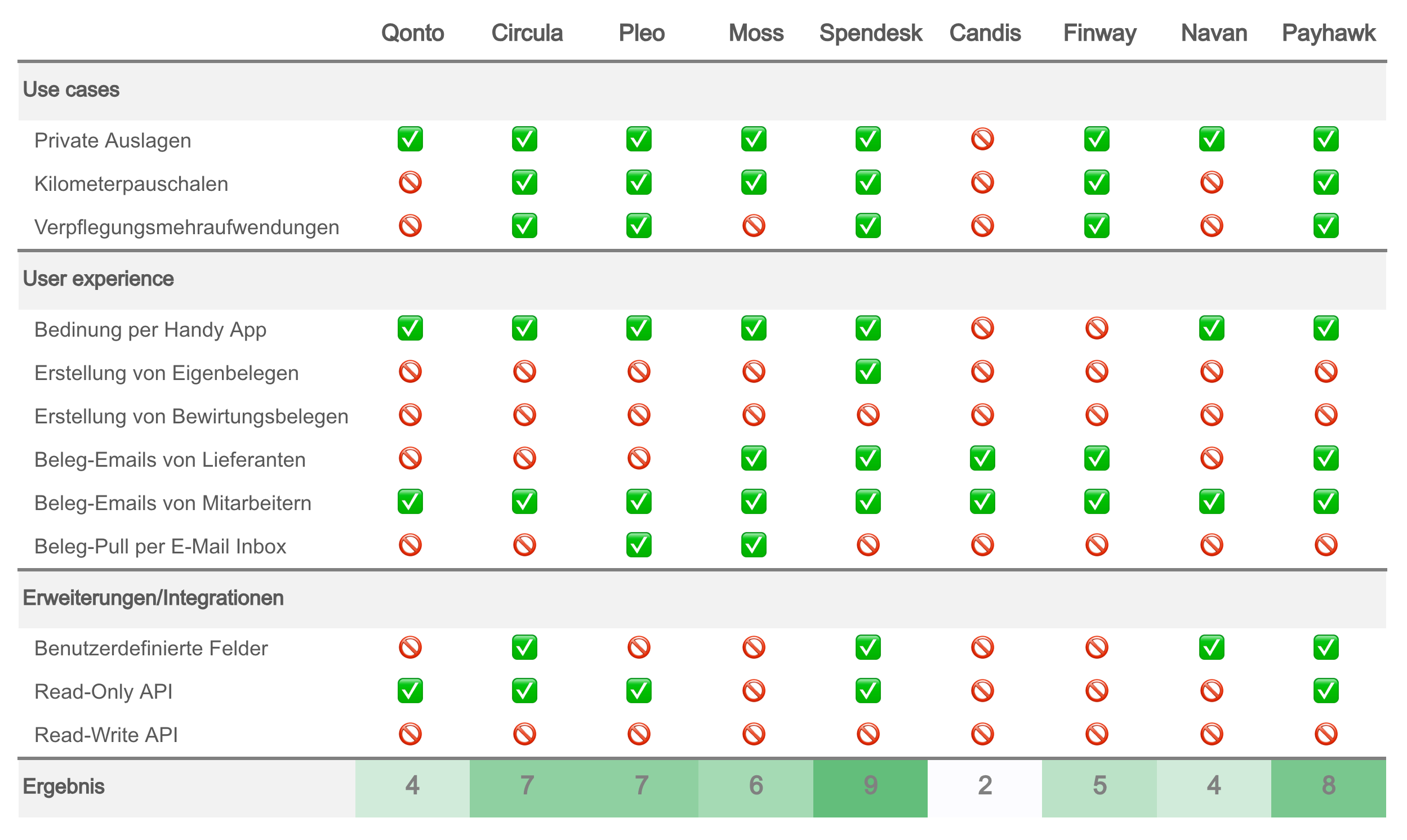 Es tummeln sich mittlerweile dutzende vermeintliche 🤔 Lösungen in dem Space: Qonto, Circula, Pleo, Moss, Spendesk, Candis, Finway, Agicap, Navan, Rydoo, Skovik, Payhawk, und viele mehr. Aber wer deckt nun wirklich die wichtigsten Funktionen ab? Längst nicht alle: